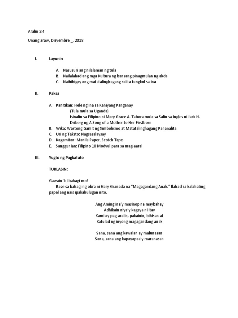 Tulad ng mga pangarap ng isang ina kasama ang kanyang mga anak ay nagsisikap na maging isang malakas matatag na sanggol at handang makamit ang mga hamon sa buhay. Ang persona sa tulang Hele Ng Ina ay ang ina ng sangol. Paano nagkatulad at nagkaiba ang kultura at kaugalian ng Uganda at Pilipinas5.
