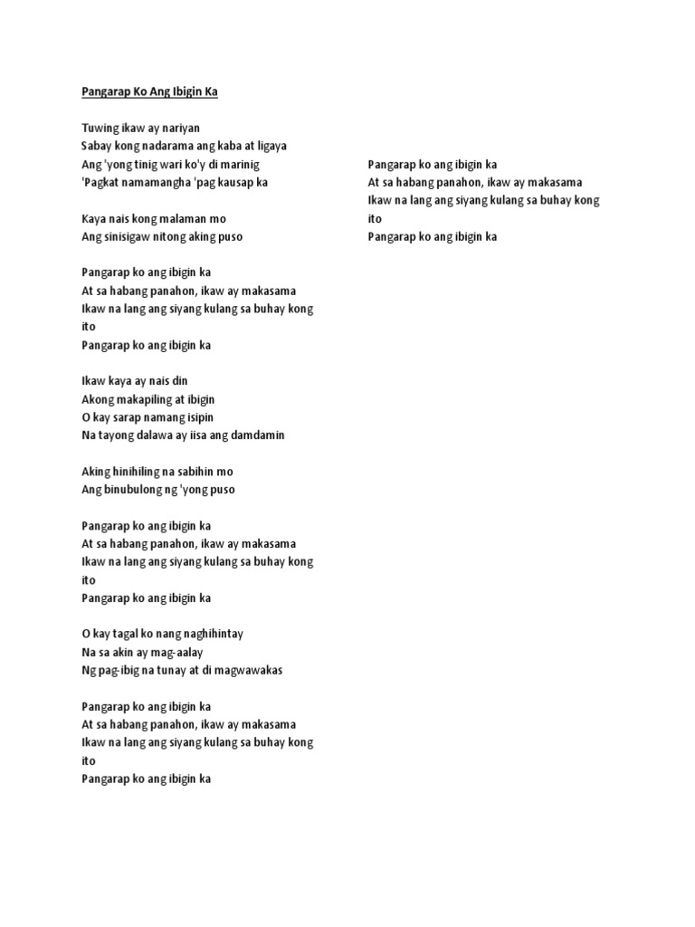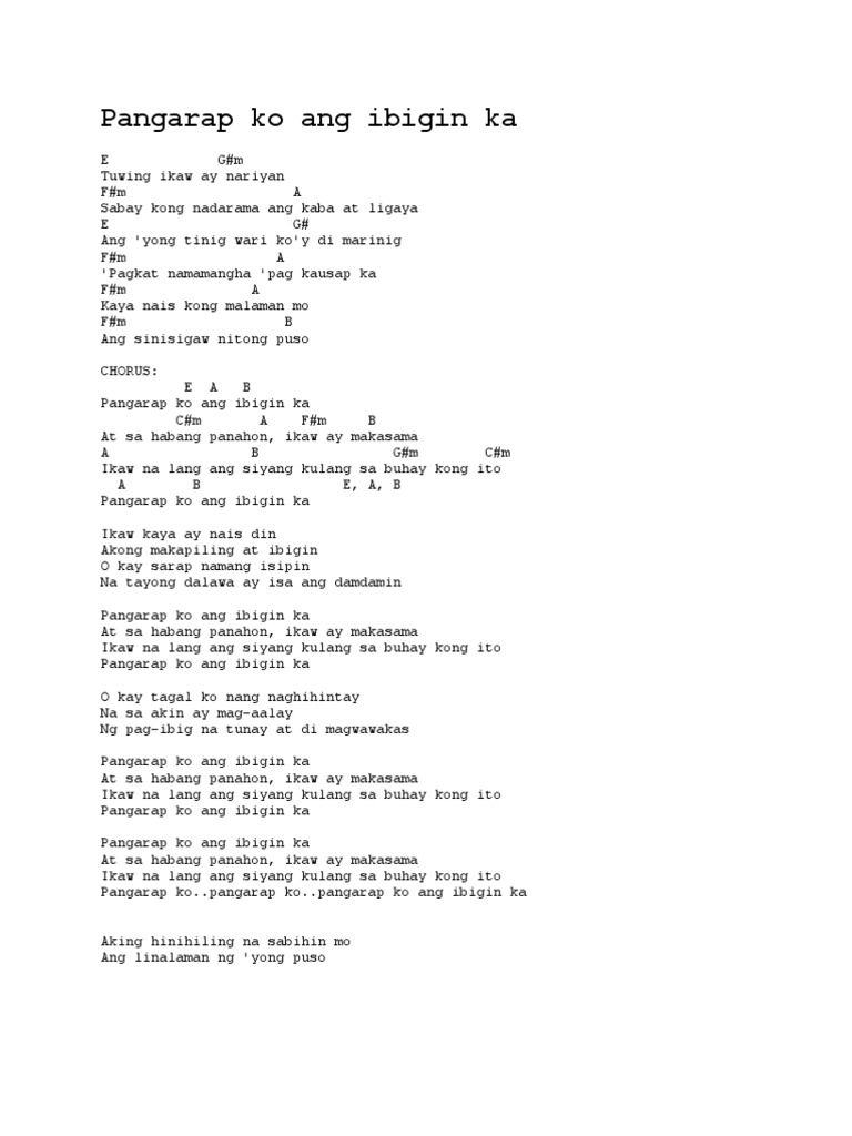 12102020 Pangarap ko ang ibigin ka sa habang panahon ikaw ay makasama ikaw lang ang siyang kulang sa buhay kong ito pangarap ko pangarap ko pangarap ko. O kay sarap namang isipin. 13022014 Capo 2 E Gm Tuwing ikaw ay nariyan Fm A Sabay kong nadarama ang kaba at ligaya E G Ang yong tinig wari koy di marinig Fm A Pagkat namamangha pag kausap ka Fm A Kaya nais kong malaman mo Fm B Ang sinisigaw nitong puso CHORUS.
