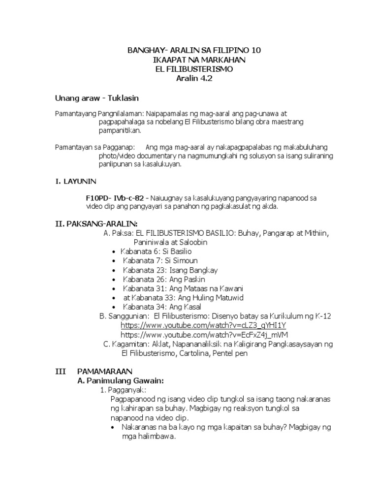 2019-09-09 BANGHAY ARALIN SA FILIPINO 10 Paaralan GORDON COLLEGE BaitangAntas 10 Guro Asignatura FILIPINO ArawPetsa Markahan IKAAPAT ILAYUNIN APamantayangPangnilala man Naipamamalas ng mag-aral ang pag-unawa at pagpapahalaga sa nobelang El Filibusterismo isang obra maestrang pampanitikan.