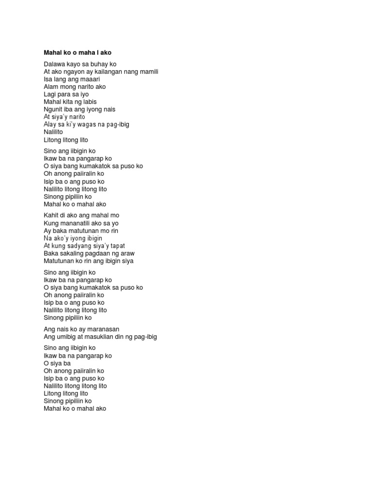 Mahal ko o mahal ako. Sinong pipiliin ko Mahal ko o mahal ako Kahit di ako ang mahal mo Kung mananatili ako sa yo. Jul 20 2016 Intro G D Em C Verse 1 G Dalawa kayo sa buhay ko D Em At ako ngayon ay kailangan nang mamili C Isa lang ang maaari G Alam mong narito ako D Lagi para sa iyo Em Mahal kita ng labis C Ngunit iba ang iyong nais Refrain Em D At siyay narito Em Alay sa kiy wagas na pag-ibig C Nalilito Litong litong lito Chorus G D Sino ang iibigin ko.